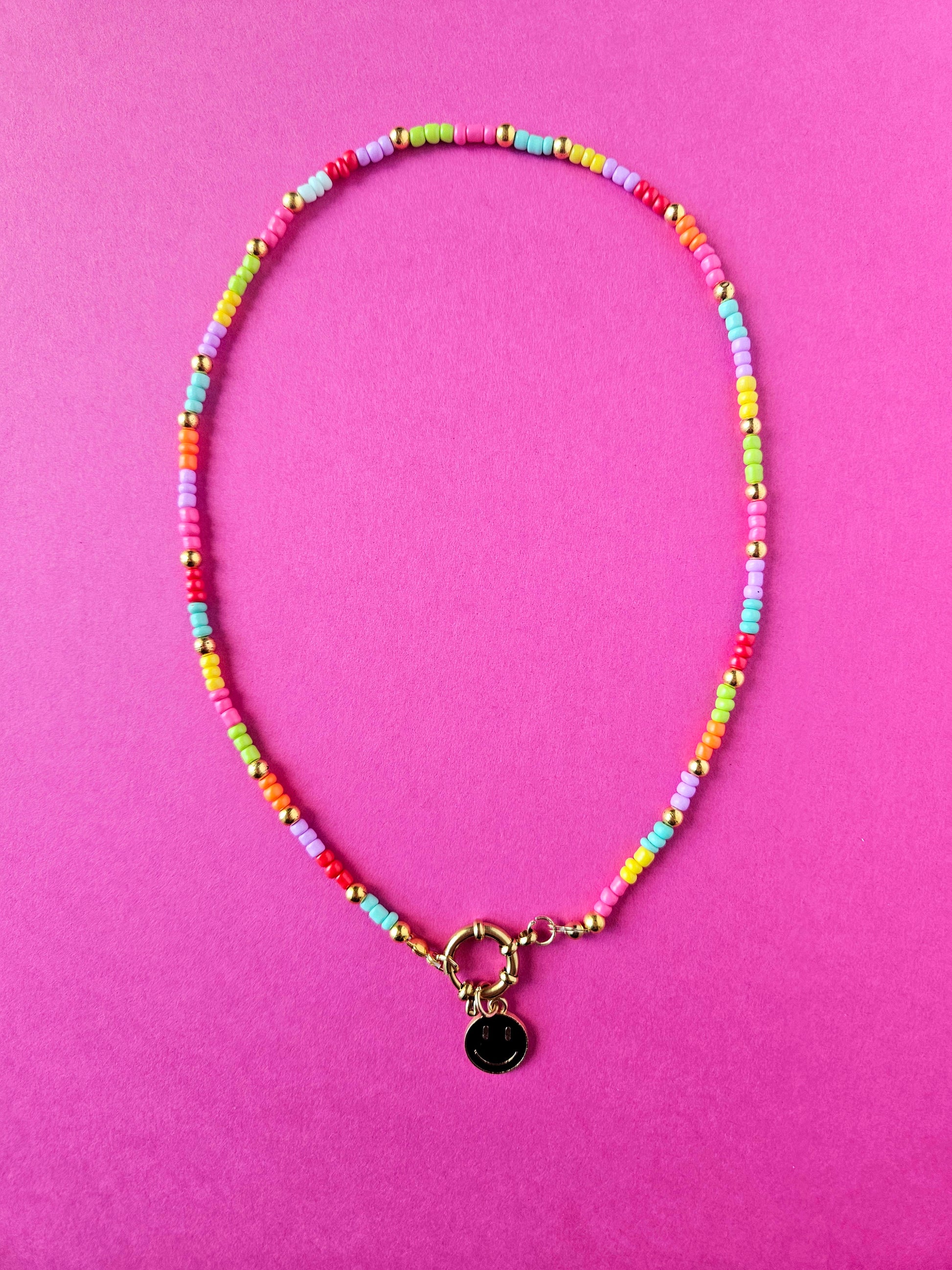 The Black Smiley Rainbow Necklace is a playful mix of colourful rainbow seed beads and a bold black smiley charm pendant β finished with a gold stainless steel clasp for everyday wear. Handmade in small batches, itβs available in two sizes so both kids and adults can join the fun.