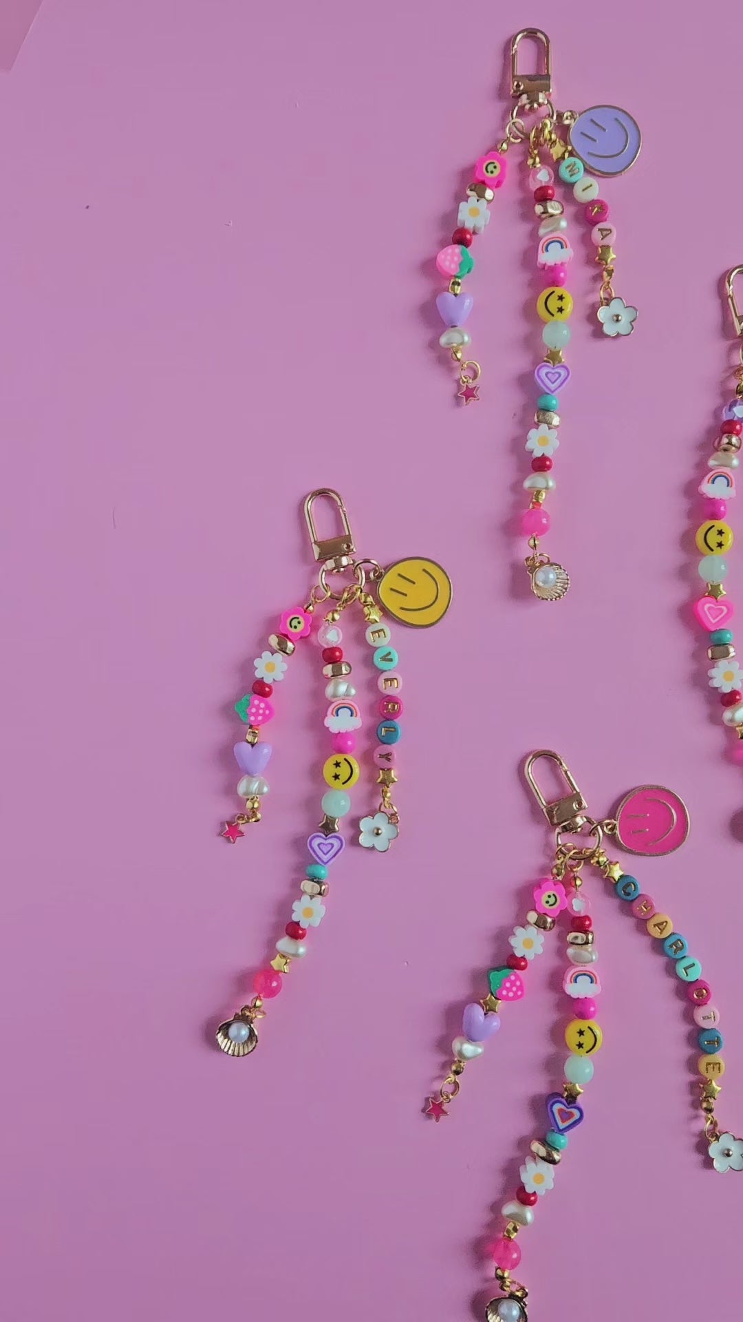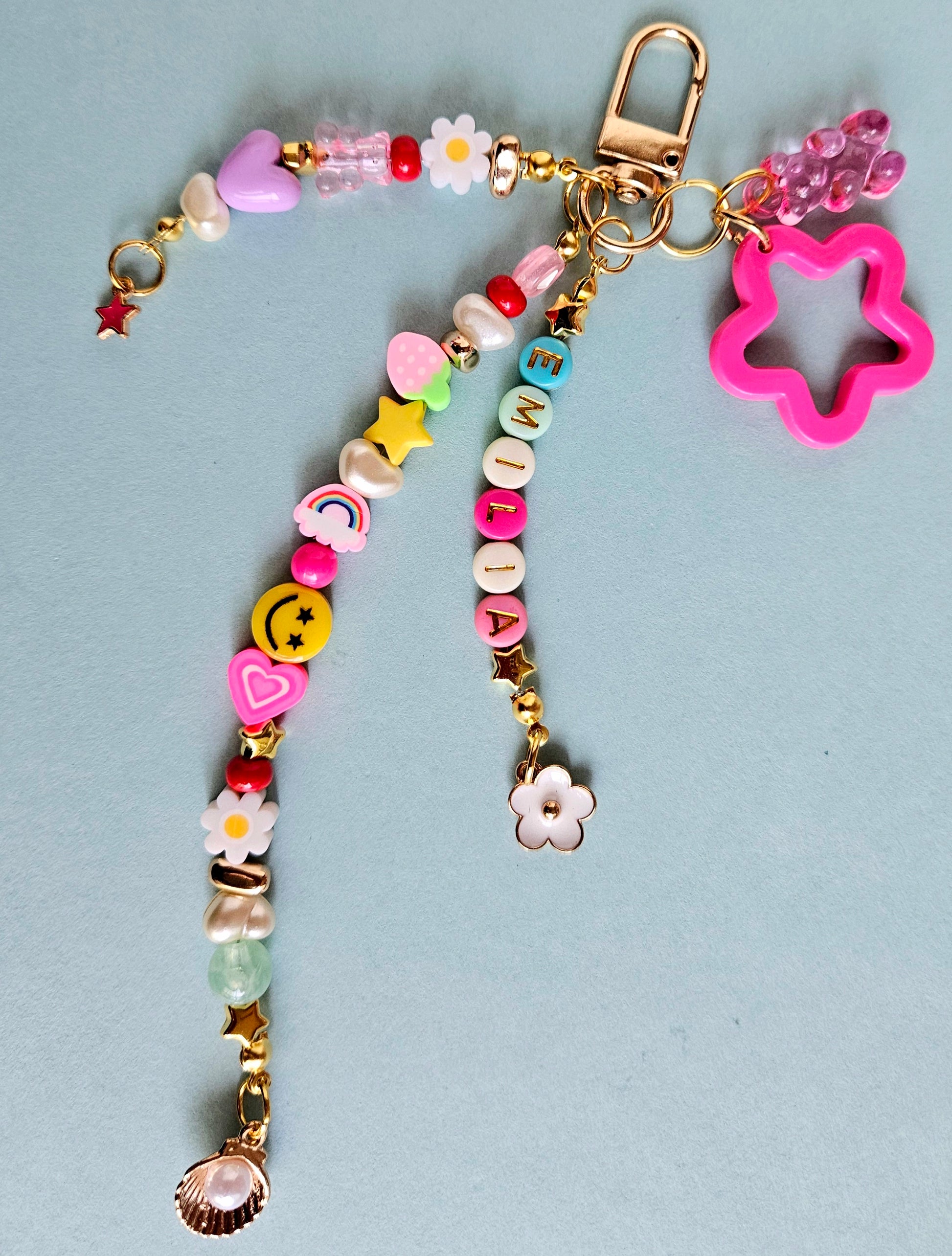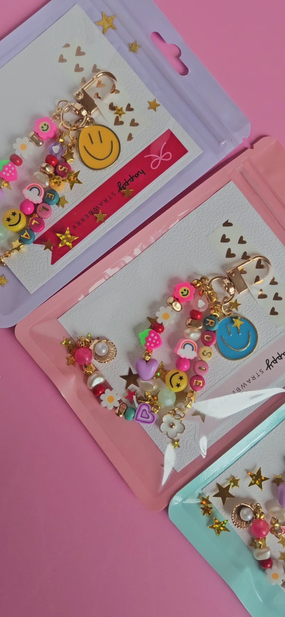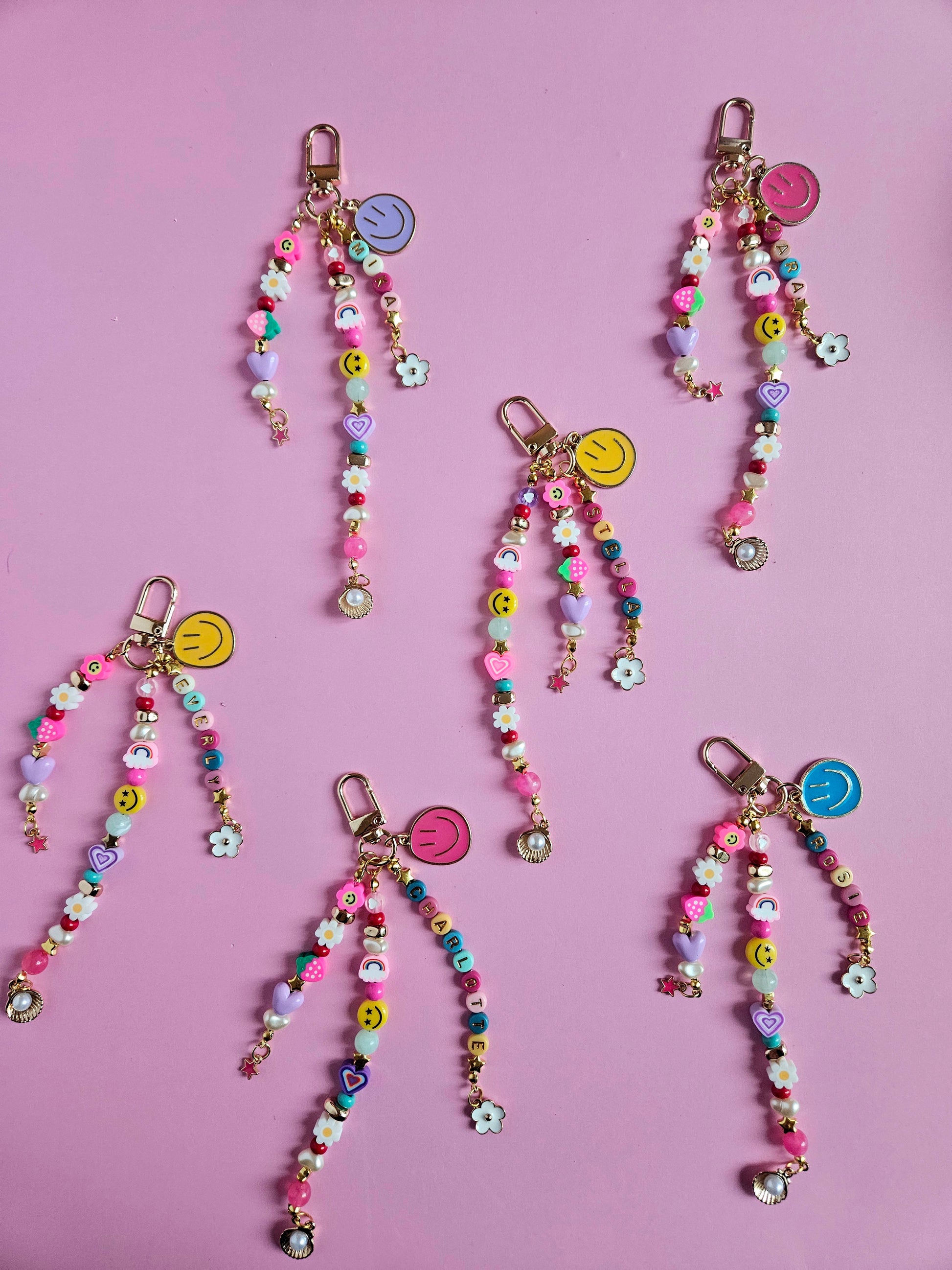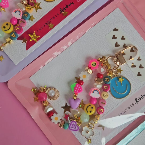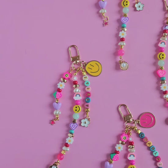 Our Personalized Bag Charm for Kids is made with three strands of colourful beads — think rainbows, smileys, fruit, daisies, hearts, stars, and pearls. To top it off, you can choose between a cheerful smiley charm or a playful gummy bear + star charm combo.