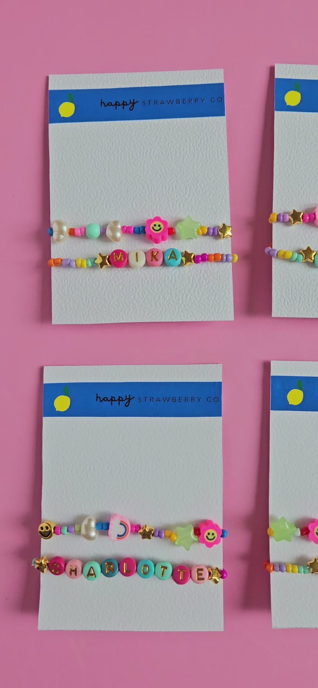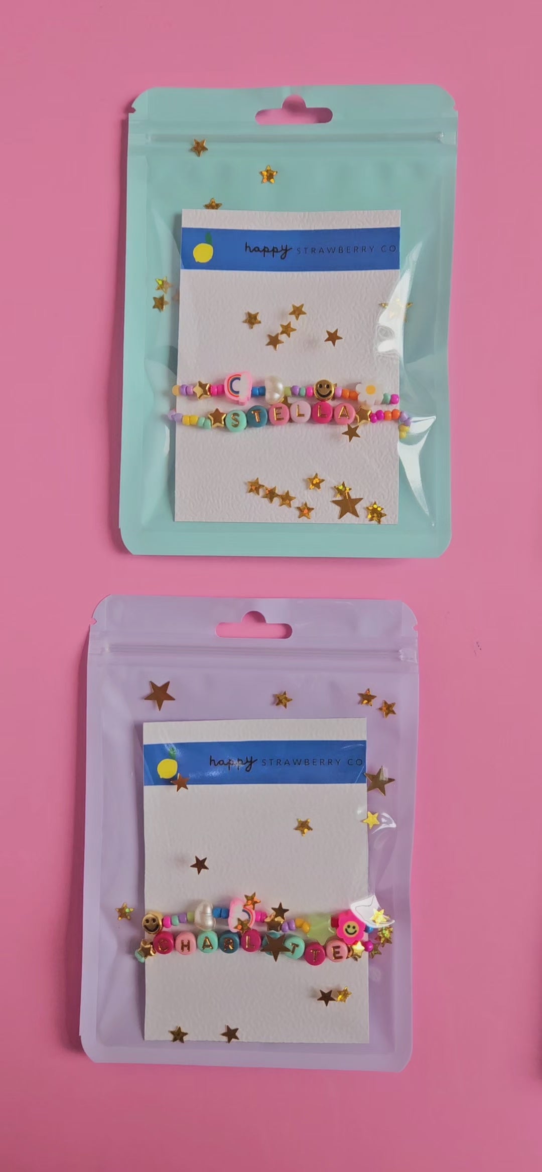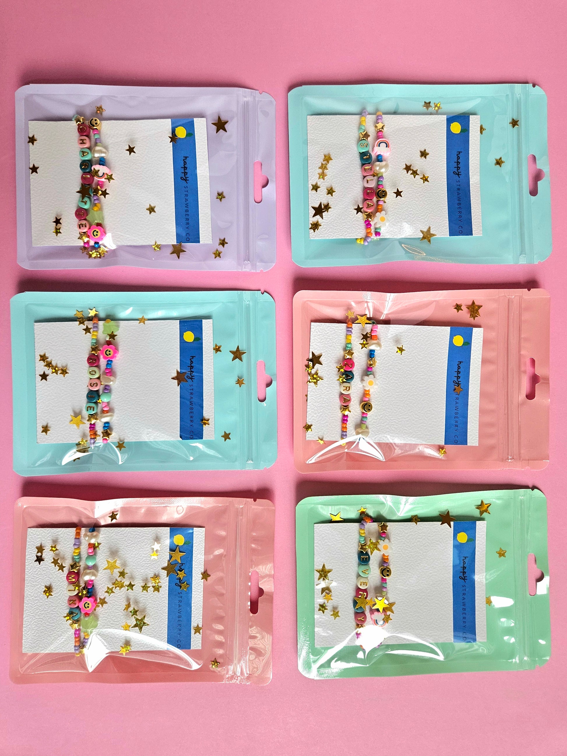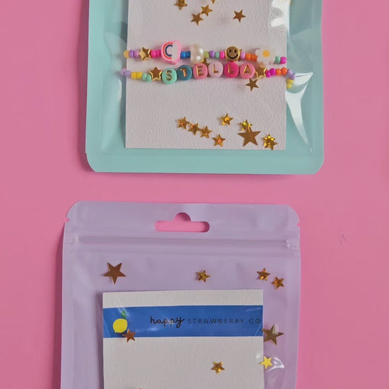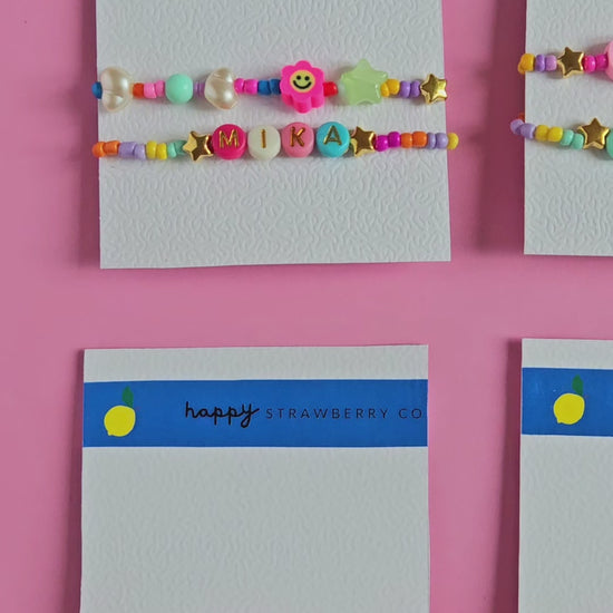 Our Personalized Bracelet Set comes with two pieces: one custom bracelet with your chosen name, phrase, or inside joke, and one coordinating beaded bracelet featuring a playful mix of rainbows, stars, pearls, daisies, and smileys.